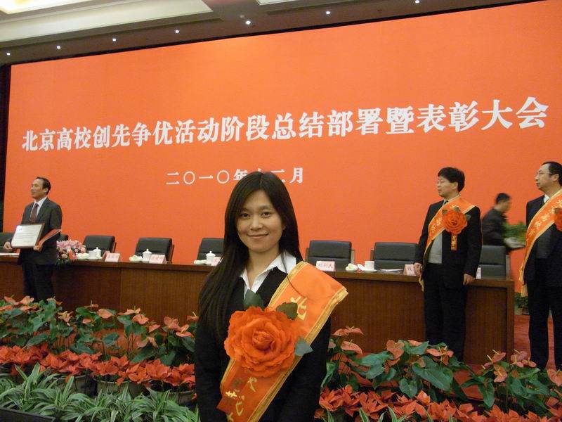 学生十佳共产党员;2010年6月,获第六届“挑战杯”首都大学生创业计划竞赛金奖;2010年4月,获第三届“全国高等院校学生语言文字基本功大赛”一等奖;2010年3月,在中共北京市委教育工作委员会举办的“首都大学生廉洁文化征文活动”中获二等奖;2008年10月,被评为首都教育系统奥运工作优秀学生;2008年9月,被评为首都大学生奥运村(残奥村)住宿服务团队“服务标兵”;2008年10月,被评为首都大学生新世纪英才学校2008级骨干志愿者;2007-2008年度,被评为91制片