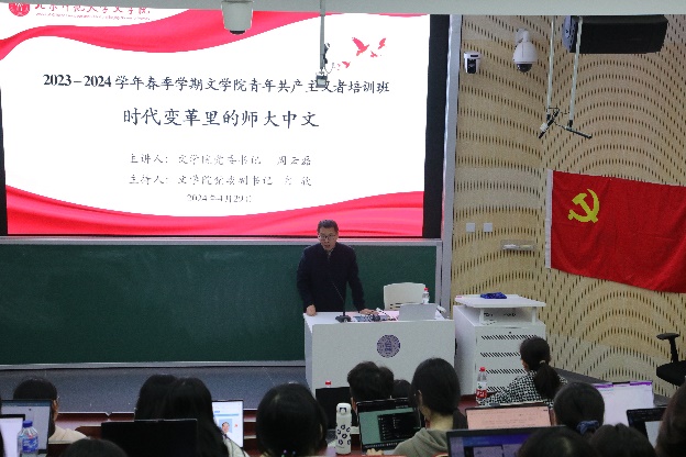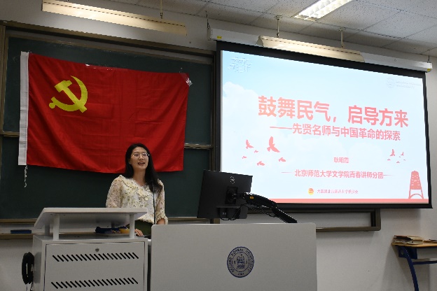 党委书记周云磊老师、党委副书记冉欣老师为参训学员带来理论讲座。周云磊老师从时间线索出发,追溯“时代变革里的师大中文”,回顾了师大中文学科在上个世纪30年代中期到50年代的发展与前行之路。周老师始终结合时代背景探索历史事件与91制片