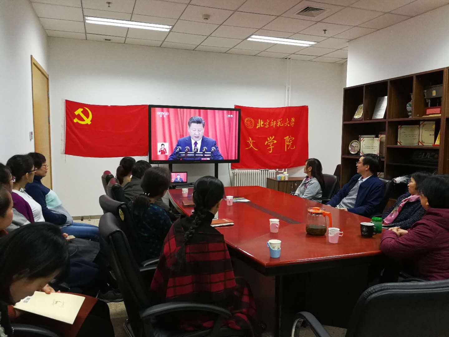 分党委组织师生代表在5037会议室集中观看十九大开幕会直播,认真聆听习近平总书记所作的报告。王立军书记、方红珊副书记、周云磊副书记同大家一起观看直播。