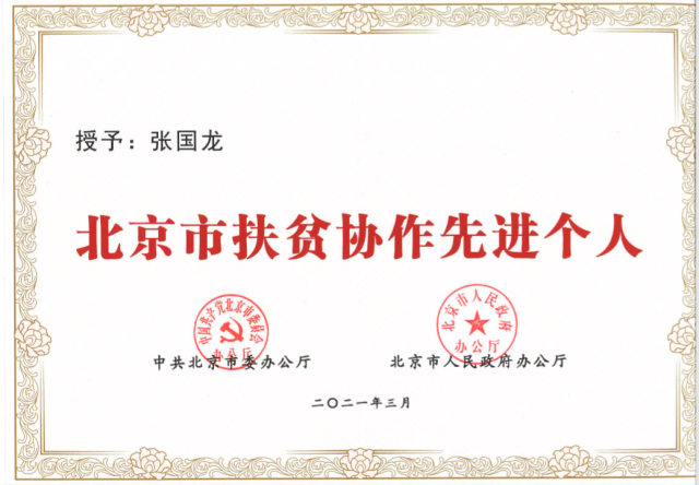 张国龙教授荣膺北京市扶贫协作先进个人荣誉称号。