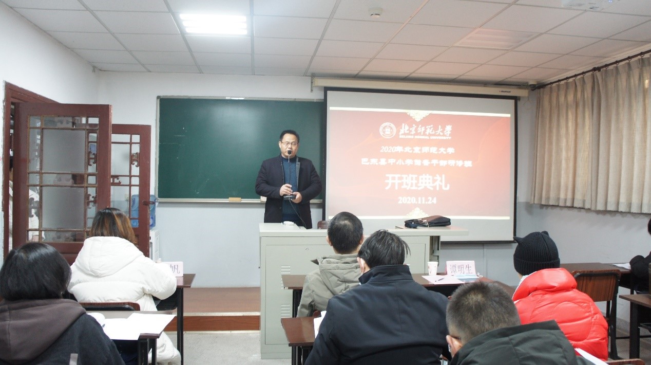 教授张国龙向各位远道而来的老师致辞,对老师们的到来表示诚挚欢迎。他在欢迎讲话中表示,北师大已经等待了各位老师118年,在这一特殊时期,巴东各地区的老师能跨越地域阻隔在北京相聚,缘分难得。希望大家能够借助十天的培训契机,暂时放下工作和家庭琐事,自我思考、自我沉淀。张教授特别强调,老师们应该结合自身教学经验,将每一堂课的内容为我所用,不仅收获到新的教育理念、教育方法,也能够加强巴东教师队伍之间的交流。最后,他衷心祝愿各位老师学有所得,在北京度过愉快而难忘的学习时光。