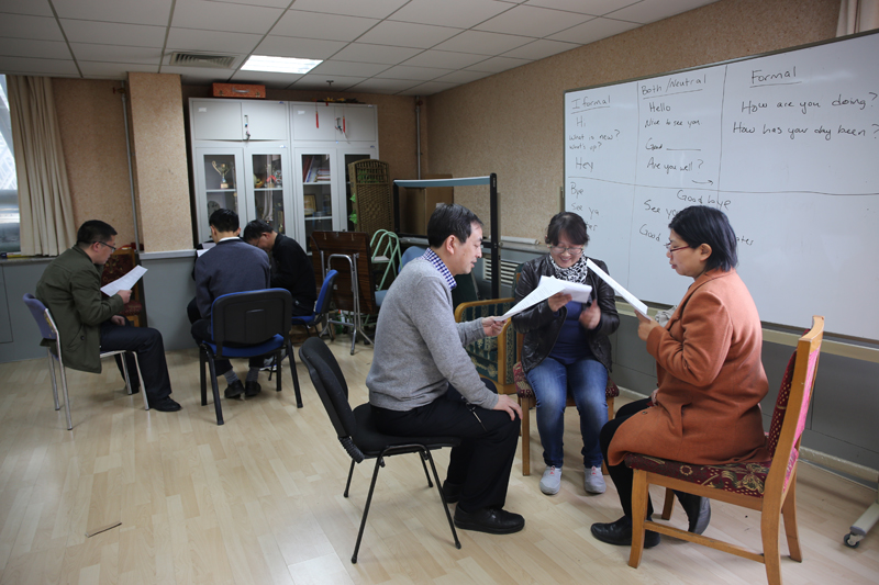 副院长姚建彬教授任中教助教。在本课的英语沙龙式实景操练活动中,组成了4个学习小组进行学习。