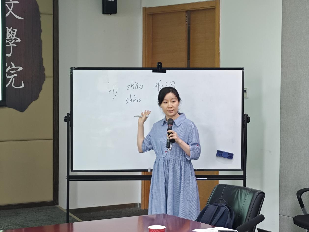 在比赛环节,青年教师们展示了各自独特的教学风格和扎实的教学基本功。钟蔚苹老师讲述了汉语的文白异读,通过深入浅出的方式阐述了文白异读现象;白如老师以因形求义为主题,巧妙地将汉字结构与词义联系起来;乐曲老师则介绍了日本汉文学的兴起,阐释了文化传播的历史;曾静涵老师对语法的概念进行了辨析,讲述了语言学的基础;任刚老师通过西厢故事与张生形象变化的讲解,展示了文学作品中人物塑造的丰富性;刘一昕老师则结合有关的案例,讲解了戏剧文学的概念。