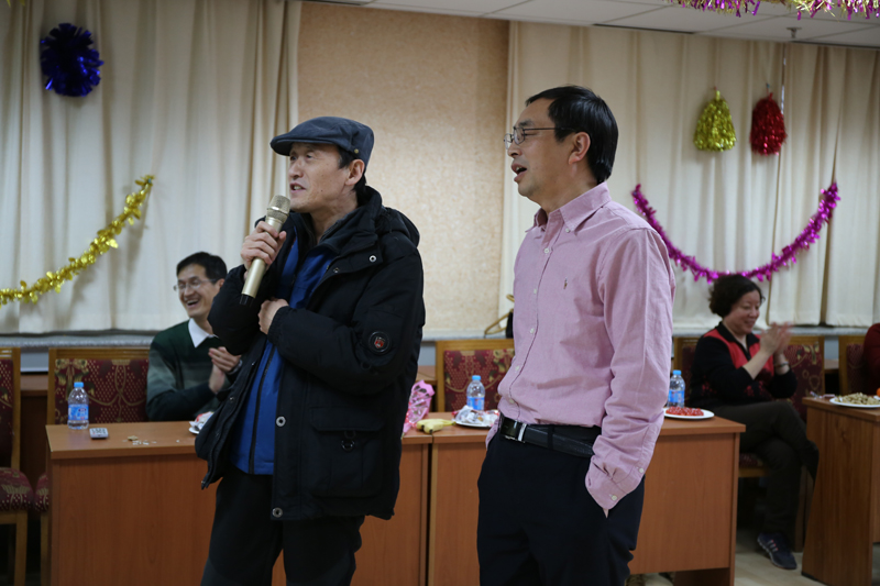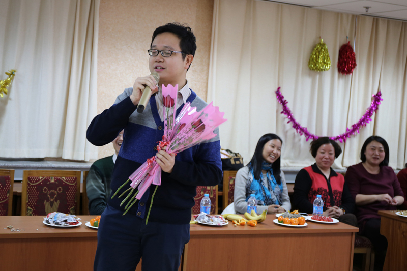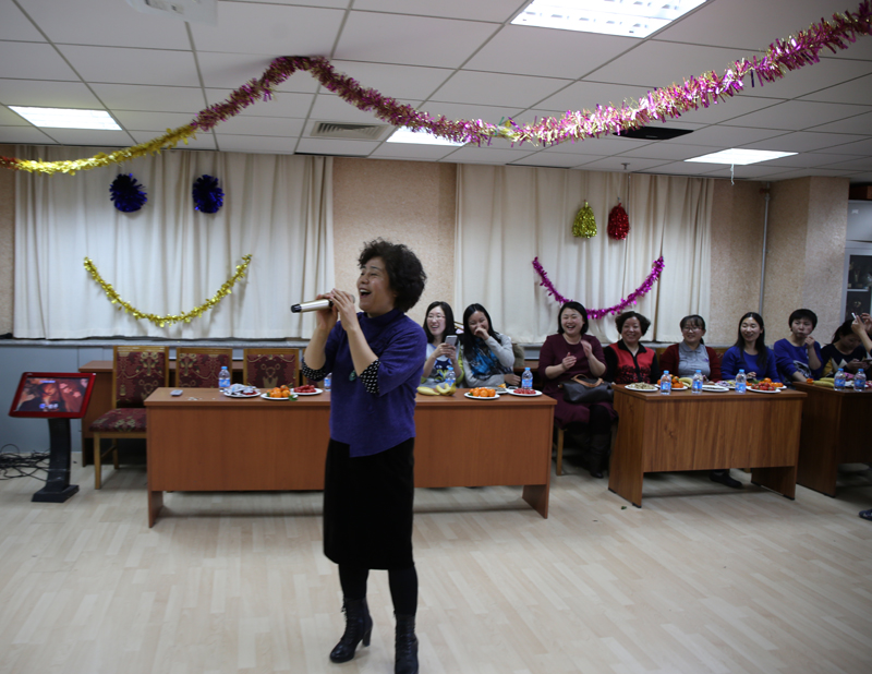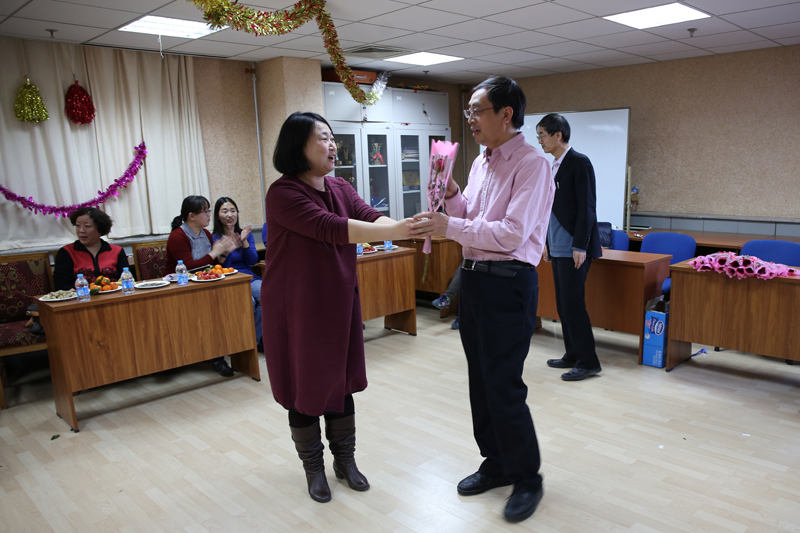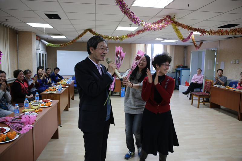 的各位男神女神悉数到场,演唱会就此拉开了序幕。各位男老师们跃跃欲试,准备一展歌喉。李国英教授的一曲《女人花》开场,恰到好处地烘托了三八妇女节的节日氛围,赢得了在场女老师们献上的束束玫瑰花;王立军教授用国语版和张哲俊教授用日语版同唱《北国之春》,可谓珠联璧合;院办马然主任标准的“周董式”发音的《发如雪》、周士宏老师粤语版的《偏偏喜欢你》、谢琰老师改良的二人转版《大约在冬季》、李小龙老师的款款情歌《信仰》征服了全体老师,博得了热烈掌声。男老师们的珠玉在前,女老师们也巾帼不让须眉,赵曦老师的京剧《贵妃醉酒》百转千回,抑扬顿挫;张燕玲老师的《甜蜜蜜》柔情似水,完全不亚于原唱。伴随着悠扬的歌声,老师们纷纷起舞。刹那间,歌婉转,舞翩跹,院工会活动室内满是一派和谐愉快的氛围。