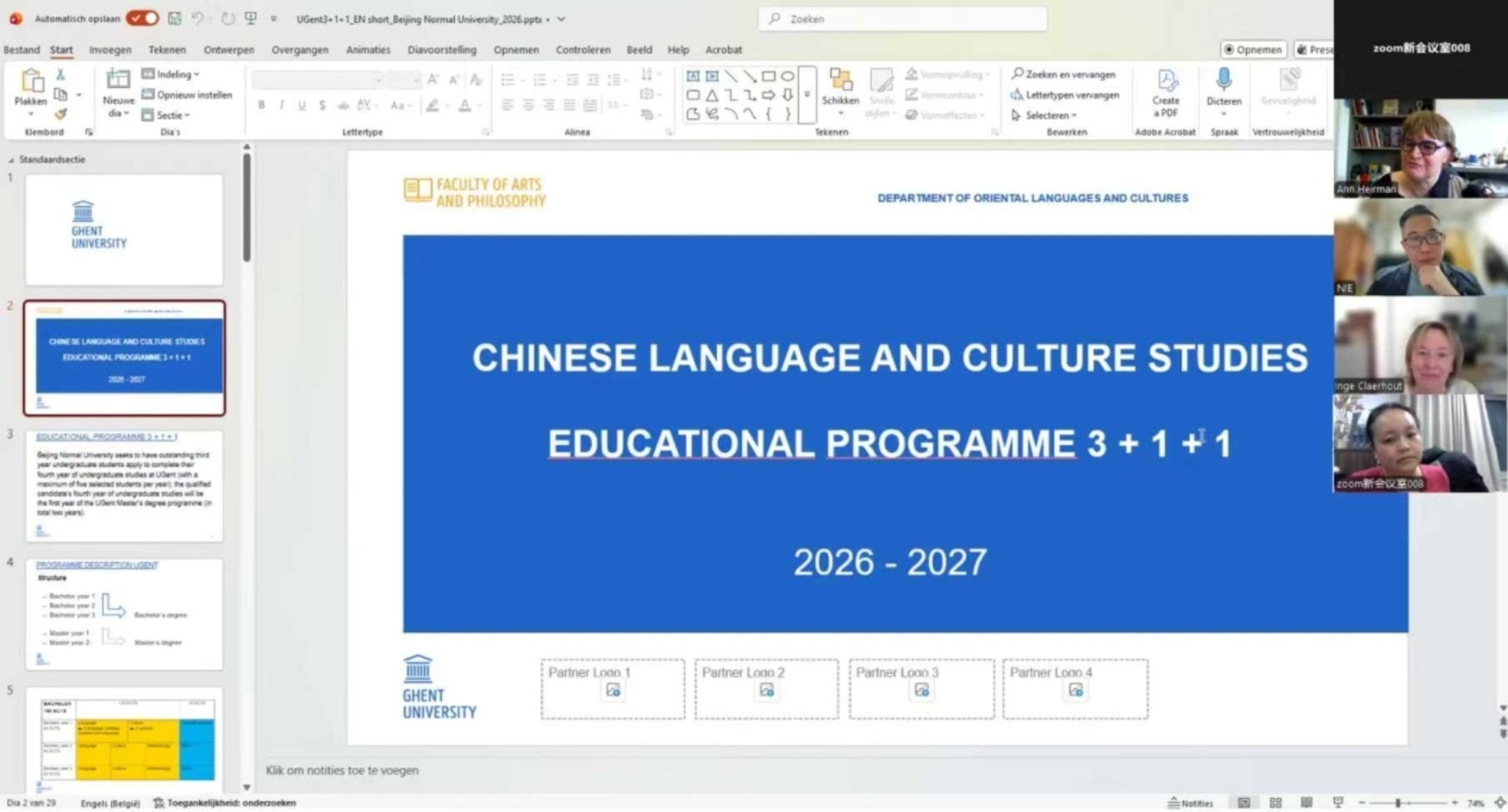 于2020年与比利时根特大学语言与文化系正式签署了3+1+1本硕双学位协议,学生在本科第四学年可以前往比利时根特大学继续学业,修读东方语言与文化专业的硕士课程,达到项目要求的学生最终可获得北师大本科学位与根特大学硕士学位。