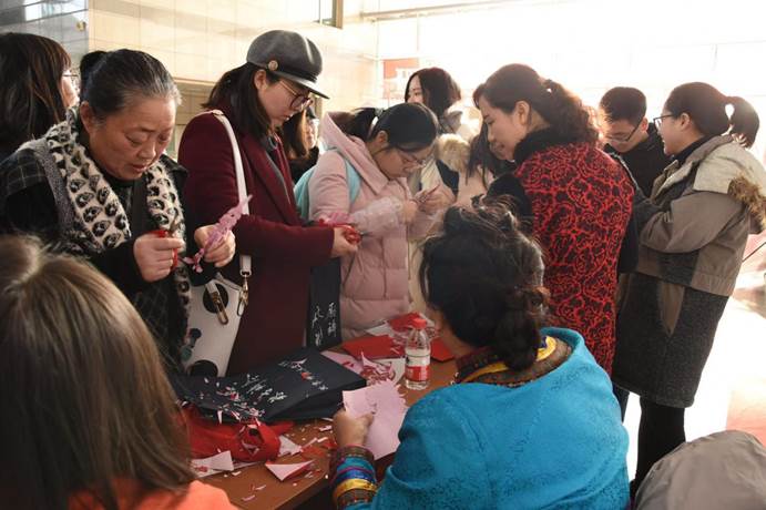 开幕式结束后,到场嘉宾和师生们一道参观了剪纸展览。几位艺术家向大家讲解了部分展览作品的文化内涵和艺术特色,并与师生们分享了他们的创作经验和灵感来源,他们还现场表演起剪纸技艺,邀请观众亲自动手体验。大家纷纷拿起剪刀,在艺术家的带领下,动手剪出各种寓意美好、图案多样的剪纸作品。广大师生兴趣高涨,虚心学习剪纸技艺,热情询问艺术家们的学艺历程,得到艺术家们的耐心解答。展览活动在大家的热切交流中进入高潮。