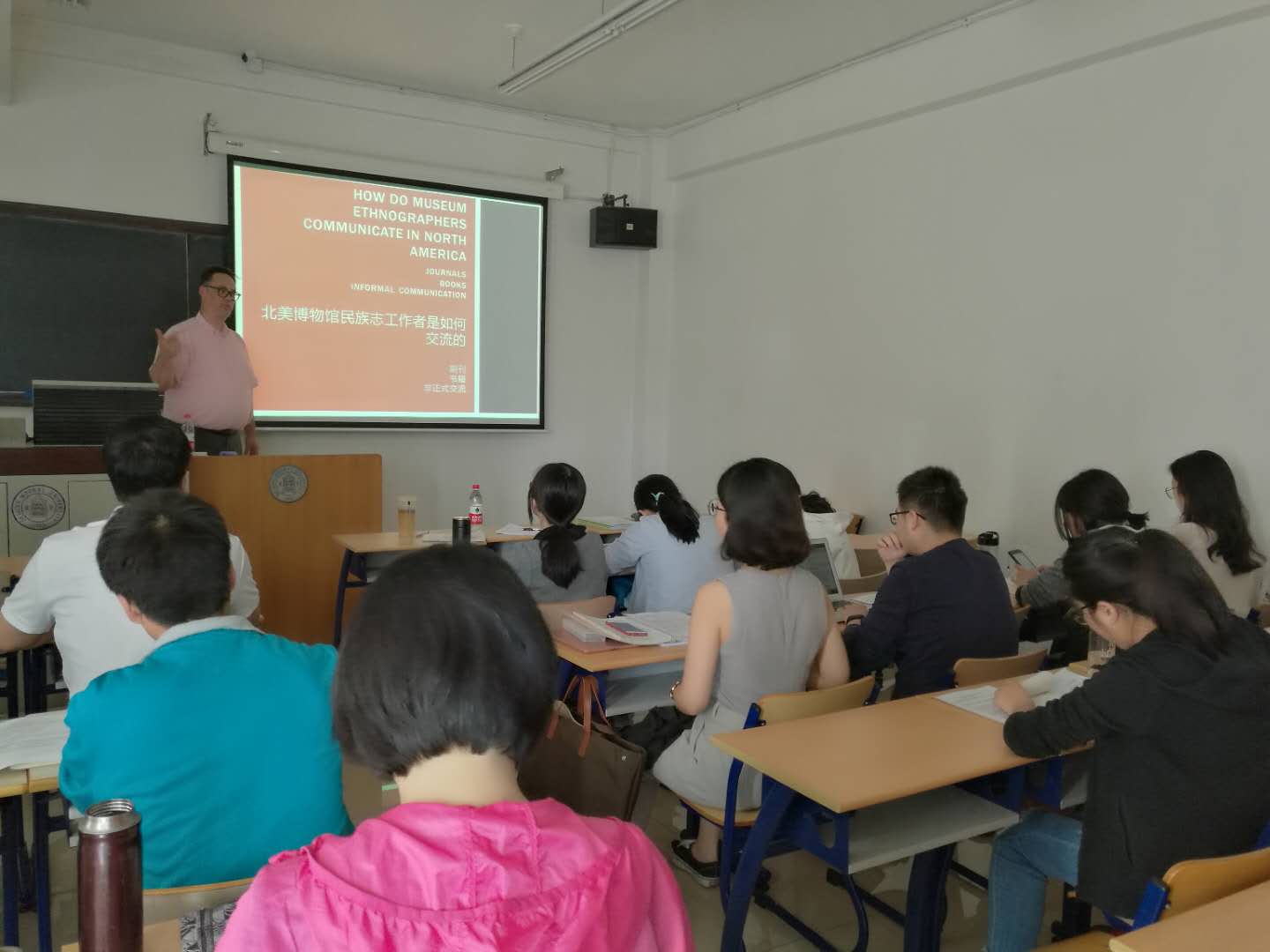 Jason Baird Jackson教授首先介绍了美国民俗学博物馆的民俗研究历史以及相关的民族志博物馆机构。在全面介绍了美国博物馆民俗研究中最相关的理论问题之后,Jackson重点介绍了北美正在进行的一些民族志博物馆项目,如互惠研究网络、印第安纳传统艺术、拼布索引、意识展厅、文化实验室、地方社区合作等。随后,他详细展示了在中国地区的博物馆合作项目,以及在广西所作的田野调查研究。