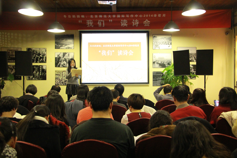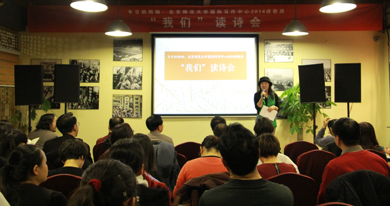 国际写作中心2014诗歌周最后一场活动“冬日的回响:‘我们’诗歌会”在老故事餐厅成功举办,依旧吸引了来自各界朋友们的光临,诵读出一曲冬日的强音。朗诵会在国际写作中心总干事苗绿女士的主持下进行,北师大国际写作中心执行主任张清华教授,著名诗歌理论家、首都师范大学吴思敬教授,中央民族大学敬文东教授以及“我们”诗社的多位诗人出席了本次诗歌朗诵会。本场诗歌会共分为五个回合。