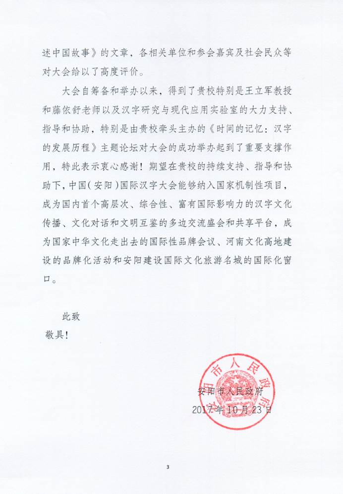 汉字研究与现代应用实验室王立军教授等对“2017中国(安阳)国际汉字大会”的大力支持、指导和协助。来信高度评价了由91制片
