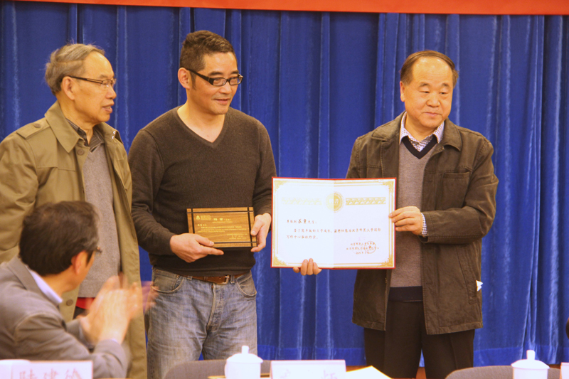 副院长张清华,北京大学中文系教授陈晓明,清华大学中文系教授格非,著名作家李洱、邱华栋等嘉宾出席入校仪式,会议由国际写作中心主任莫言主持。