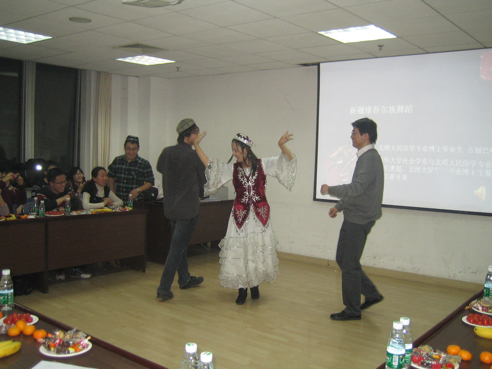 副院长姚建彬博士代表院领导出席会议并致辞,他在讲话中,对清华大学社会学系和北师大民俗学国家重点合作开展教学和高级人才培养工作,给予充分肯定,希望双方进一步整合校际优势资源,积极创新开拓。清华大学人文社会科学学院院长李强教授即席讲话,他深情地回忆了钟敬文先生的生前嘱托,认为两学科合作的目标,就是要认认真真地继承前辈大师爱国重教的学术传统,踏踏实实地建设学科,真正培养出一些有利于国家社会建设和学术发展的有用人才,他还对新时期博士生人才的特点做了高度概括,对十年合作的成绩做了扼要总结。北师大民俗学国家重点学科师生和清华大学社会学系部分博硕研究生和博士后到会。钟敬文先生的印度弟子、北师大民俗学国家重点学科访问学者、印度尼赫鲁大学中国与东南亚研究中心主任墨普德教授,应邀出席了晚会。首都师范大学政法学院副教授周锦章,代表北师大民俗学国家重点学科与清华大学社会学系联合培养的博士毕业生生游睿山等发言,感谢两校合作导师的辛勤工作。两校研究生合作表演了国粹与国风混声演唱,中外民歌大联唱和多民族歌舞等,节目丰富多彩,演出畅情尽兴。墨普德教授即兴演唱了孟加位民歌《熊峰》和中国民歌《康定情歌》,色音教授代表教师演唱了蒙古族民歌《美丽的草原我的家》和《我所热恋的这片土地》,中外师生精彩的表演迎来全场阵阵喝彩。最后全体与会师生合唱《长大后我就成了你》,牢记新时期我国高校改革进程中的学科建设使命,欢庆新一年的到来,加强团结,继往开来。