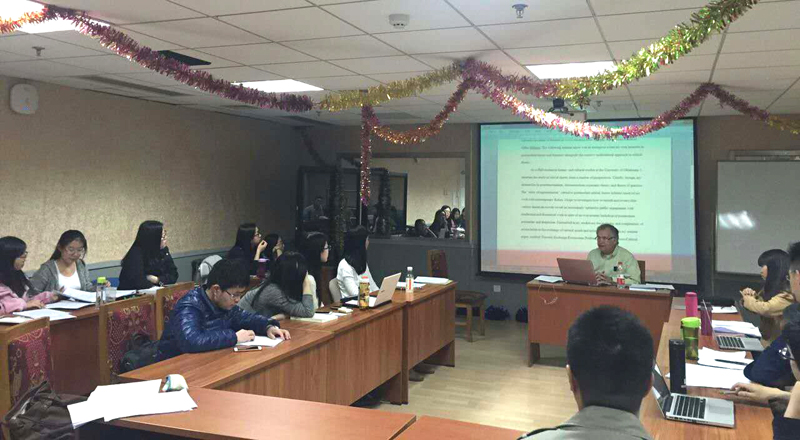 Schleifer教授是美国俄克拉荷马大学英语系教授和俄克拉荷马大学医学院的兼职教授,富布莱特高级专家学者,著名文学期刊《流派》的主编,研究范围涉及文学评论、爱尔兰文学、圣经及哲学、语言学等领域。在精心准备的讲座中,Schleifer教授以文学与痛苦的关系为引子,就“什么是文学理论”、“什么是比较文学”等问题讲述了自己的观点。之后Schleifer教授带领学生对赛义徳的文本“知识的政治学”(“The Politics of Knowledge”)和自己的文章“什么是文学理论”(“What Is Literary Theory”)进行研读。Schleifer教授请同学们找出自己最喜欢的段落和理解有困难的段落,并就这些段落与同学们展开讨论。为了加深同学们对这两篇文本的理解,Schleifer教授着重讲解了几个术语,诸如“ideology”、“worldliness”、“defamiliarization”、“critical thinking”等等。在这个过程中,同学们加深了自己对“理论”、“文学理论”和“后殖民主义文学”的理解。