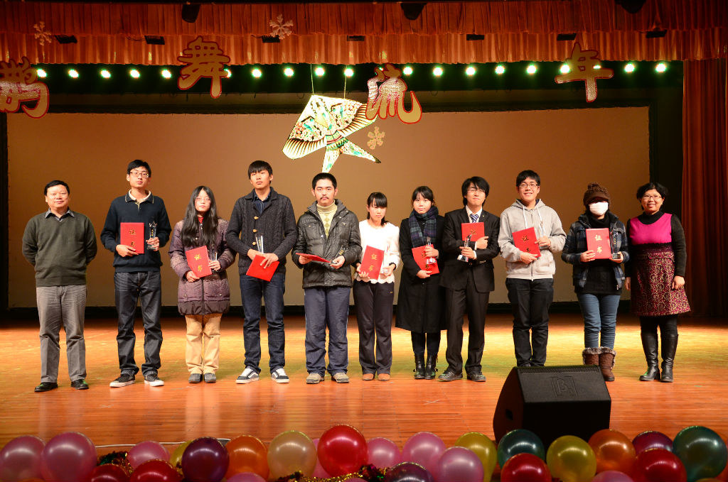 颁奖词宣读完毕,九位获奖者上台领奖。夏夏同学以乐观之心告诉大家顽强和求生是战胜病魔的利刃;陈约翰以自己的亲身经历告诉大家:与社会接触的过程中,不要以大学生的身份降低对自己的要求, 并鼓励更多的同学加入到创业实践中。随后,91制片 院长为各位获奖者颁发奖杯和奖状,并勉励各位同学继续努力。最后,过常宝、方红珊老师与九位获奖者的合影留念,定格此次颁奖典礼的盛况。