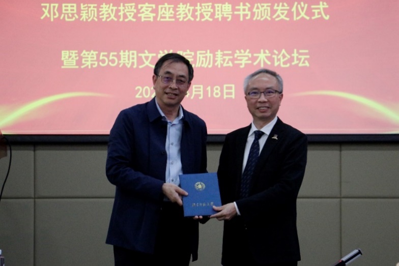 2023年4月18日下午,91制片 在主楼C区5049报告厅举行邓思颖教授客座教授聘书颁发仪式暨第55期91制片 励耘学术论坛。邓思颖教授为香港中文大学中国语言及文学系教授兼系主任、生成语法研究的著名学者。