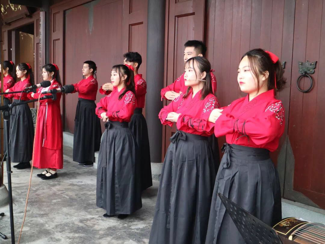 南山诗社则围绕始自楚辞中沧浪之歌的中国古代文人的渔夫情怀,选取了白朴的《沉醉东风·渔夫》、郑板桥的《道情》以及楚辞中渔夫所歌《孺子歌》进行精心编排,作为本次参与展演的节目。来自南山诗社的十二名同学或操琴,或执铃铛、木鱼,或撑伞,或持扇,以吟唱的形式,用动人的音乐,将渔夫闲看秋江、与沙鸥白鹭为伴的清闲生活以及士大夫怀才不遇的愤懑心情一同生动呈现在观众面前。