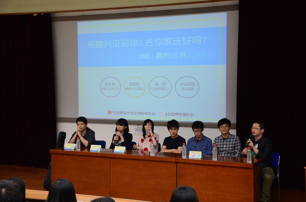 学生会与北师青年联合主办的ONE团队北京之旅“one·一个”专场讲座在教九502举行,嘉宾由三位编辑和ONE幕后团队组成。