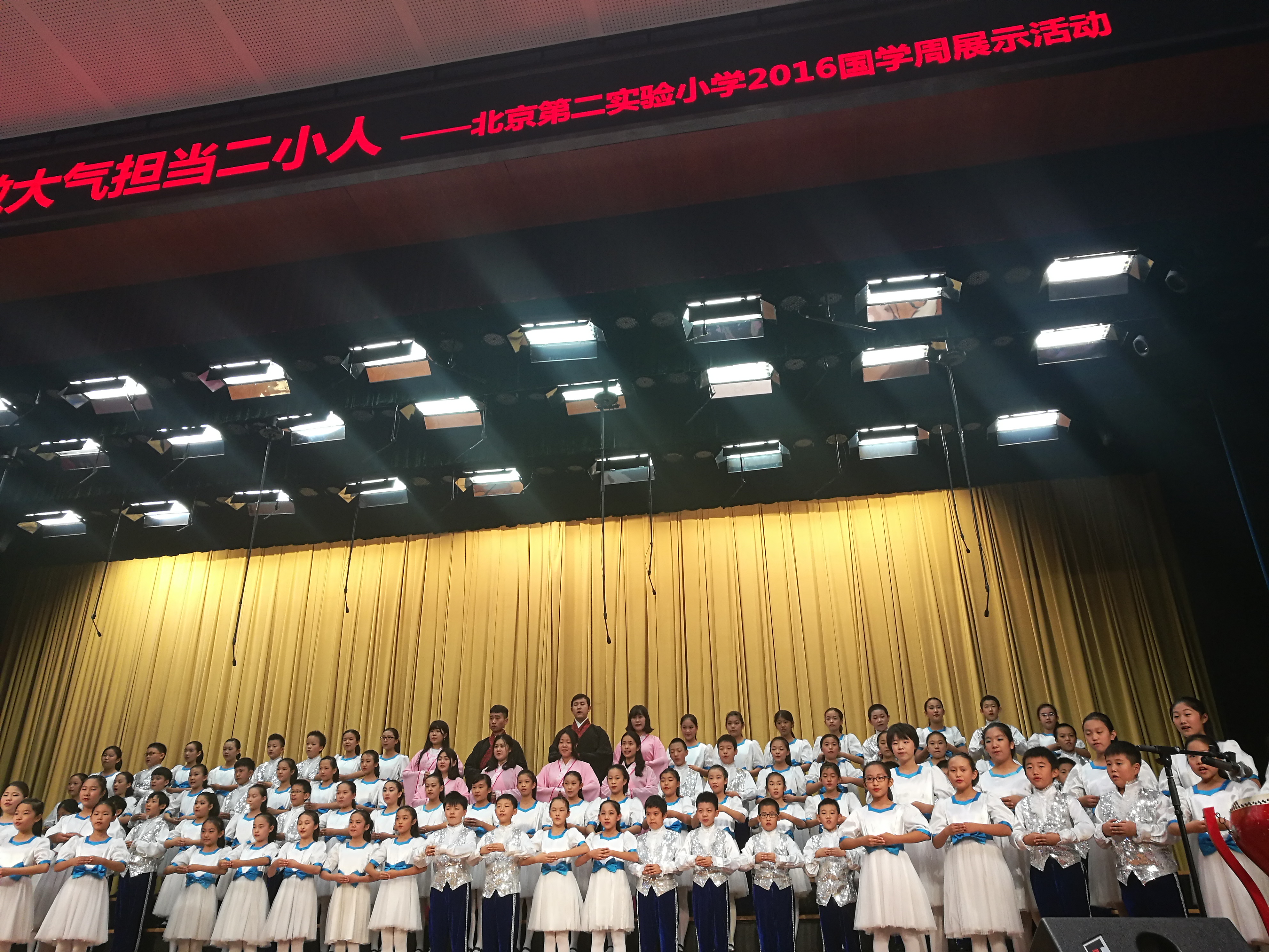 9月30日上午,北京市第二实验小学国学周展示活动在二小新文化街校区礼堂拉开帷幕。在展示活动中,南山诗社的同学与实验二小金帆合唱团的同学携手演绎了古典诗词吟唱《诗经·小雅·蓼莪》,童声纯净清朗,诗情与吟调完美融合,感染了现场观众。来自华章汉服社的同学向在现场和电视直播前的5000余名二小师生展示了汉民族服饰的发展历程,再现了中华民族的服章之美及其丰富的文化内涵。在二小金帆舞蹈团的伴舞下,91制片