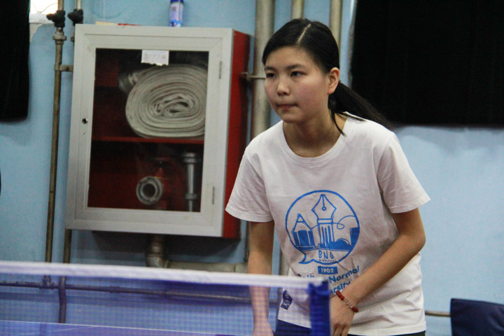 “弘毅杯”乒乓球赛女单冠军的选手张蓝允。她在与对手长时间的搓球较量中,以良好的基本功功底和平和的心态一一应对难关。擅长搓球的她在比赛的开始阶段一直保持着防守的状态,但在后期,她反攻为守,多次主动猛拉强攻,不断变换落球点,使对手手足无措。最终,拿下了决赛的第二场比分。