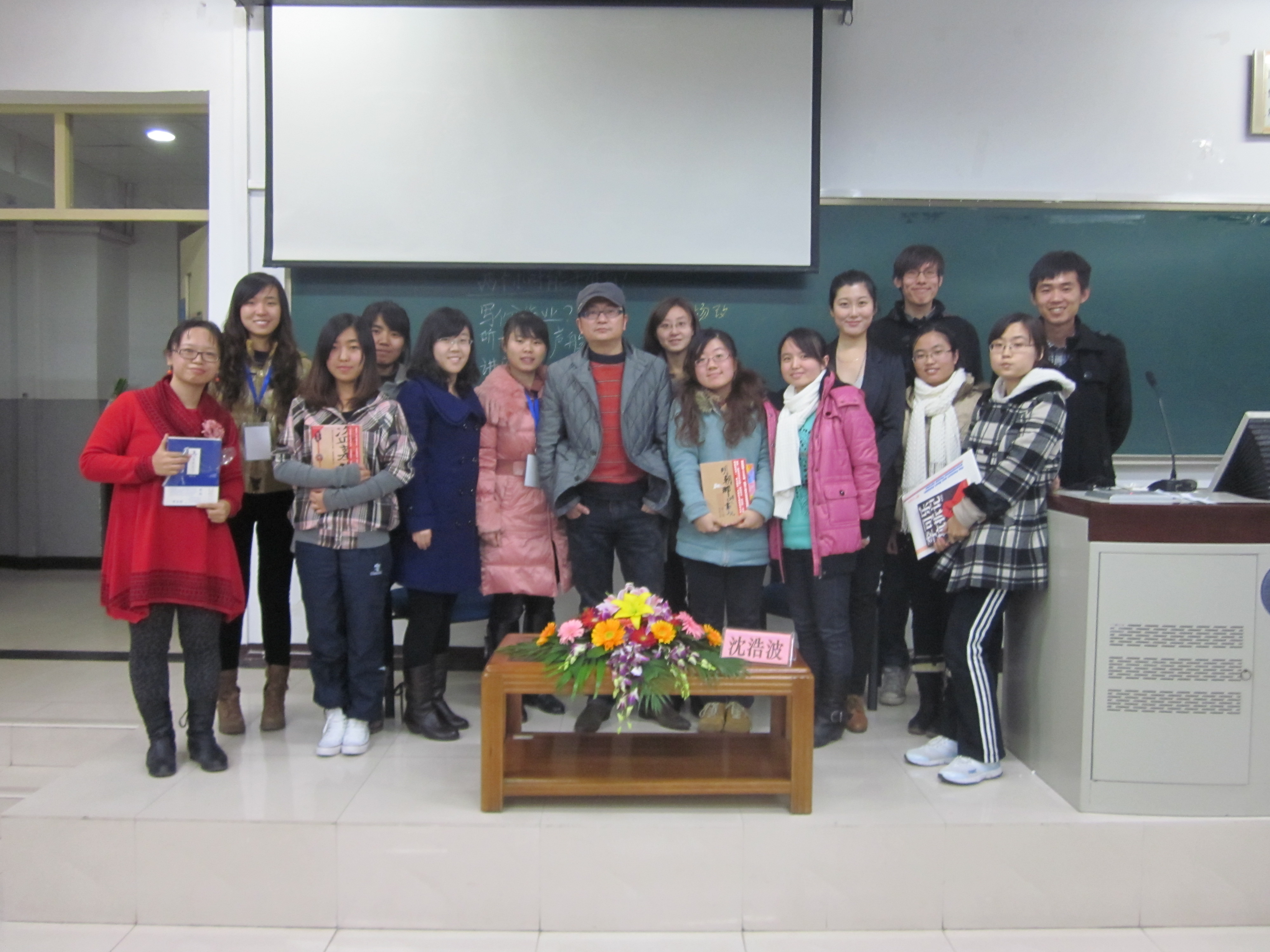 讲座进入互动环节,沈浩波积极回答了同学们提出的一些问题,包括“对青春派小说的看法”、“对自己诗歌评价的看法”、“对朋友和人生的理解”、“对韩寒的评价”,并将“务实”二字送给大家。讲座最后,沈浩波现场抽奖,赠送图书,并与同学们合影留念。此次讲座在热烈的气氛中圆满结束。