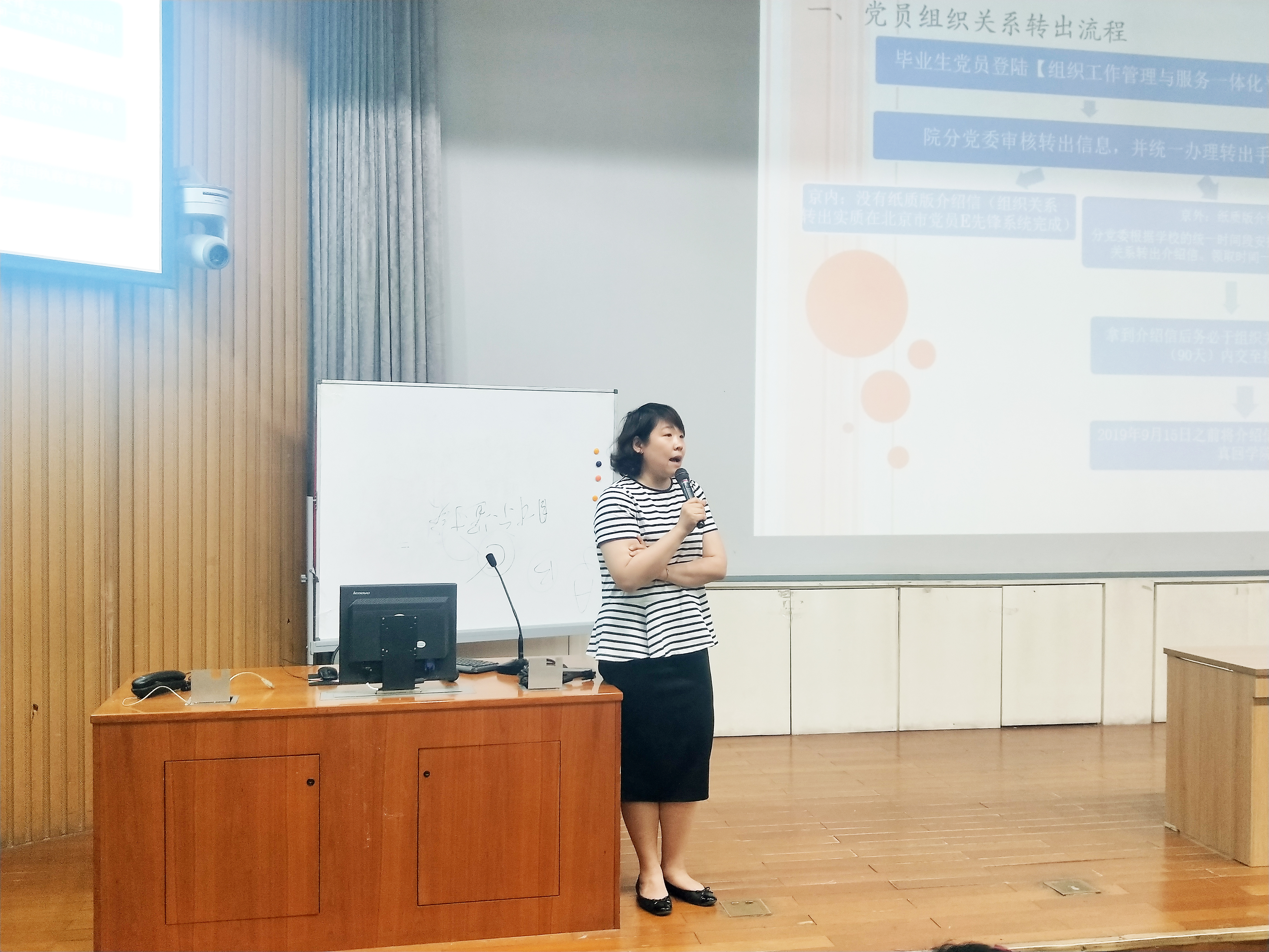 本次大会对党员组织关系转出和毕业去向系统填写等毕业生离校手续作了详尽的说明,帮助在场毕业生对毕业派遣、党组织关系转出及相关政策有了进一步了解。