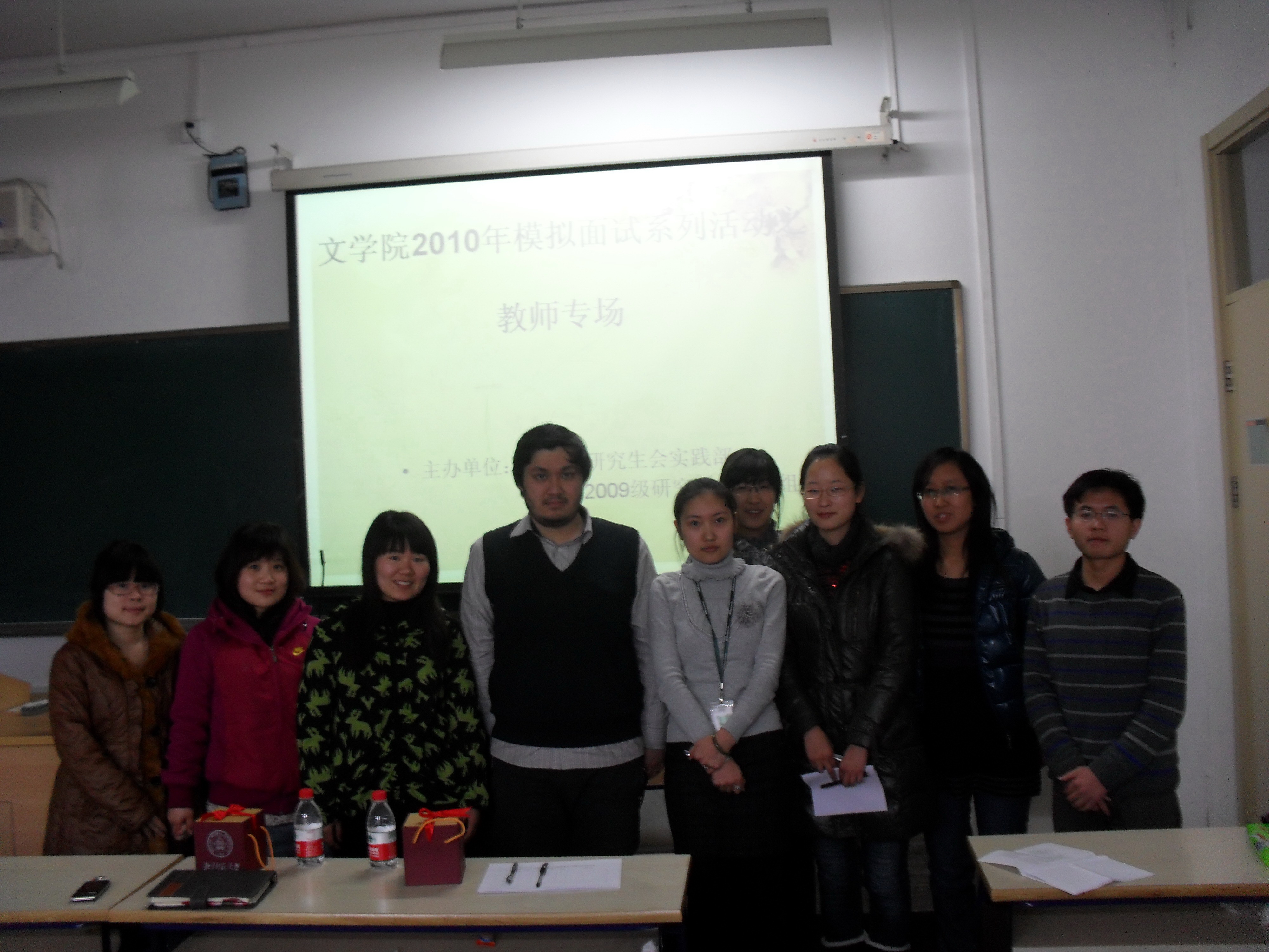 2010年模拟面试系列活动——教师专场”在教二楼215教室举行,此次模拟面试邀请到了新东方学校的资深教师邵老师、杨老师作为点评嘉宾,参与活动的研究生60余人,活动现场气氛热烈。